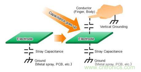 如上圖所示,為電容自感應(yīng)方式,自感應(yīng)方式是檢測電容量的增加,當(dāng)按下鍵時,電容量將增加。潮濕的表面也會增加電容率,造成按鍵誤觸,如下圖所示。