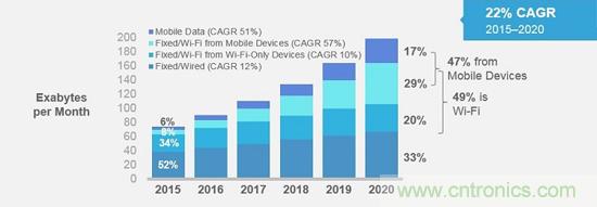 移動(dòng)網(wǎng)絡(luò)和Wi-Fi流量占有率比較。固定式/Wi-Fi流量自2018年起超越固定式/有線(wired)網(wǎng)絡(luò)流量(來(lái)源:Cisco)