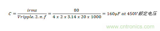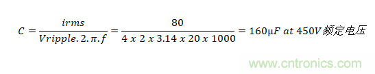 如果僅需要電容器來控制電動汽車動力系統(tǒng)等直流線路上的紋波電壓,則在選擇電容器時將會呈現顯著不同。 總線電壓可能與以前一樣為400V,但由采用電池供電,因此不存在穿越需求。在下游轉換器以20kHz的開關頻率提取80Arms脈沖電流時,將紋波限制在4Vrms以內是非常現實的, 所需的電容是: