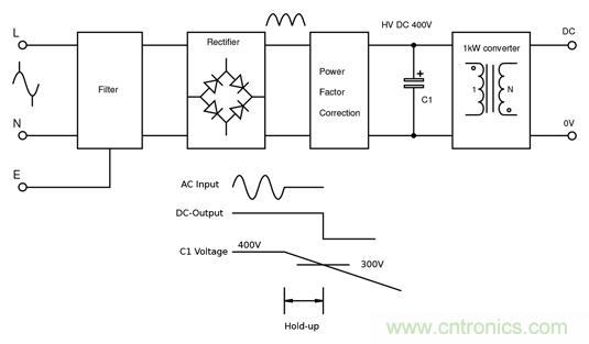 假設效率為90%,并且電壓降(Vd)為300V,低于該值,將會失去輸出調節(jié)功能。如果發(fā)生停電,當總線電壓從400V降至300V時,大容量電容器C1提供能量以保持恒定的輸出功率。 我們可以計算在電壓降至300V以下之前要進行20ms穿越所需的C1值: