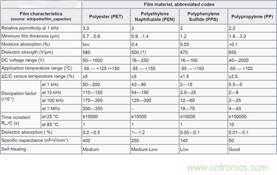 表1比較了常用薄膜電容器類型的特性。聚酯類可在低電壓下使用,而聚丙烯由于其低損耗因數(DF)和單位厚度的高介電擊穿能力,因此通常在高應力下表現出最低的損耗和最高的可靠性。DF相對比較穩(wěn)定,不隨溫度和頻率有很大變化。 分段高結晶金屬化聚丙烯也可采用,并且能提供與鋁電解電容相當的能量密度。
