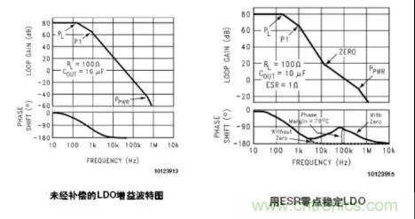 假設(shè)一個LDO系統(tǒng)在0dB時的截止頻率是30kHz。在其輸出端增加輸出電容為10uF,輸出電容的ESR=1ohm。則在16kHz處產(chǎn)生零點。
