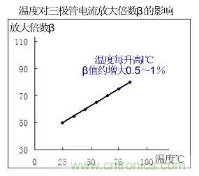溫度上升,β、IC將增大,UCE將下降,在電路設計時應考慮采取相應的措施,如遠離熱源、散熱等,克服溫度對三極管性能的影響。