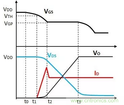 階段3(t2-t3)為米勒平臺(tái),VGS電壓保持米勒平臺(tái)電壓VGP,整個(gè)過程中,VDS電壓逐漸下降到低的電壓值,ID電流保持不變。