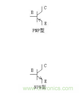 一般,管型是NPN還是PNP應(yīng)從管殼上標(biāo)注的型號(hào)來(lái)辨別。依照部頒標(biāo)準(zhǔn),三極管型號(hào)的第二位(字母),A、C表示PNP管,B、D表示NPN管,例如: