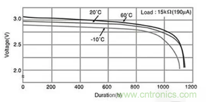 圖5:在190μA的典型無(wú)線傳感器平均電流負(fù)載和20°C的工作溫度下,CR2032電池可維持>2.7V電壓1000 小時(shí)。(圖片來(lái)源:Panasonic)
