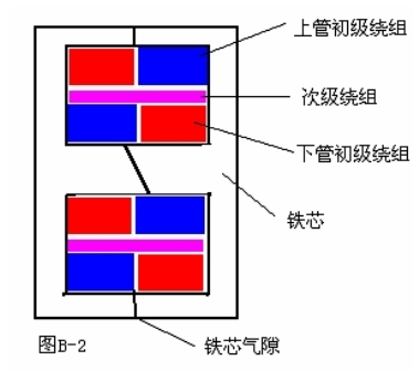 最后說(shuō)一說(shuō)繞組線(xiàn)圈的結(jié)構(gòu),因?yàn)槟憴C(jī)的后級(jí)都是用對(duì)管組成推挽電路的,為了防止由于兩管負(fù)載不平衡所引鐵芯起直流磁化,上下管的負(fù)載繞組不僅要做到電感一致,并且直流電阻也要一致,另外為了較少線(xiàn)間分布電容,在繞法上采取分層分邊的繞法,如圖B-2是音頻輸出變壓器繞組的結(jié)構(gòu)剖面圖。這種繞組結(jié)構(gòu)可使上下輸出管的總電抗保持一致,從減少線(xiàn)間的分布電容的角度來(lái)看,層分得越多越細(xì)越好,從而使輸出信號(hào)的頻響特性得到較好的改善。