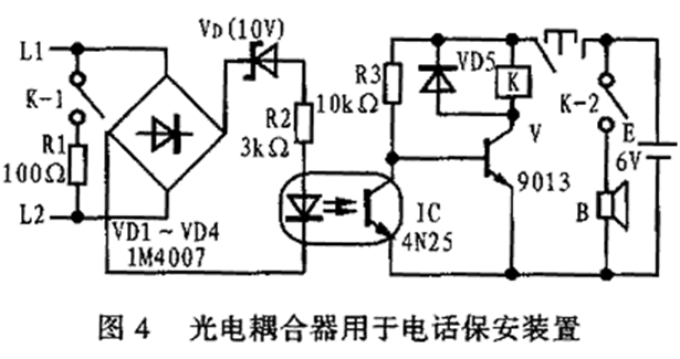 為了防止電話線路被并機(jī)竊用或電話機(jī)被盜用通話,可以利用光電耦合器來(lái)設(shè)計(jì)一個(gè)簡(jiǎn)單實(shí)用的電話保安電路,其實(shí)隔電路如圖4所示。圖中,由VD1~VD4組成極性轉(zhuǎn)換電路。由于在將本保安器接入電話線路中時(shí),不需要分清電話線路反饋電壓的極性,因此,使用該保安器可以給安裝帶來(lái)很大的方便。