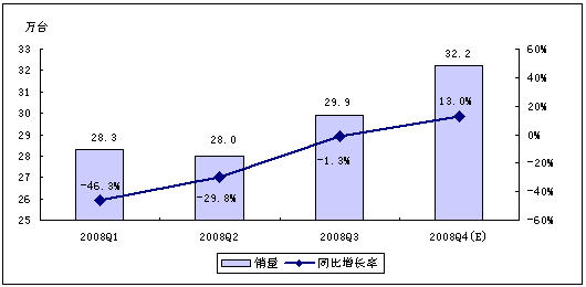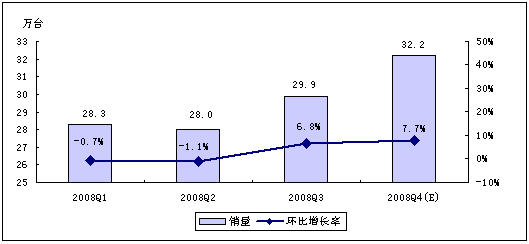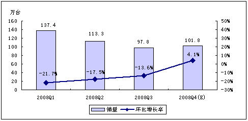 賽迪顧問預(yù)測,受全球經(jīng)濟危機以及中國經(jīng)濟發(fā)展趨緩等因素影響,2008年第四季度,MP3/PMP播放機行業(yè)將不會呈現(xiàn)快速增長的勢頭,但年終禮品市場的啟動,在一定程度上仍然會拉動整體市場向前發(fā)展。賽迪顧問預(yù)計,2008年第四季度,中國MP3/PMP播放機市場銷量為134.0萬臺,銷售額將達7.9億元。