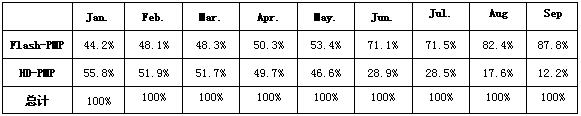 在MP3播放機領(lǐng)域,占存介質(zhì)產(chǎn)品獨占市場,而在PMP播放機領(lǐng)域,閃存介質(zhì)已經(jīng)得到PMP播放機廠商的普遍重視。2008年1-3季度,閃存型PMP產(chǎn)品銷量份額從1月份的44.2%上升到6月的87.8%。