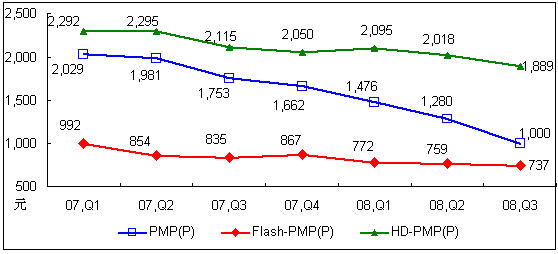 2007年Q1-2008年Q3中國PMP播放機市場不同存儲介質(zhì)產(chǎn)品價格走勢