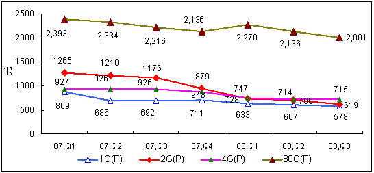 2007年Q1-2008年Q3中國PMP播放機市場主要容量產(chǎn)品價格走勢