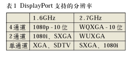DisplayPort是一個高帶寬、雙向顯示互連,可以實(shí)現(xiàn)內(nèi)置和外置顯示連接的通用新一代接口標(biāo)準(zhǔn)。憑借可擴(kuò)展SerDes技術(shù)及改變通道數(shù)和速度,顯示系統(tǒng)可采用DisplayPort接口標(biāo)準(zhǔn)來支持各種分辨率,使其成為數(shù)字電視的理想選擇。表1顯示了一些由不同速度和通道數(shù)支持的DisplayPort的分辨率實(shí)例。