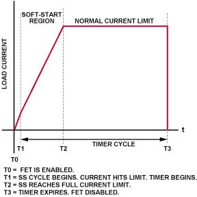 利用軟啟動,浪涌電流在軟啟電容設(shè)定的期間可以從零線性增加到滿量程。通過逐步提高基準(zhǔn)電流,能避免浪涌電流突然達(dá)到30 A的限制。需要注意的是,在軟啟過程中,電流處于調(diào)整過程中,因此,定時器從軟啟動開始之際就進(jìn)入工作狀態(tài),如圖5所示。