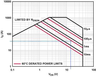 在40 V,降額后的功率所對應(yīng)的電流為14 A,在SOA圖上這點(diǎn)將確定新的62°C降額后的1 ms線。使用同樣的辦法可確定新的10 ms以及100 μs線。新線在圖6中以紅色示出。
