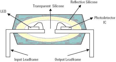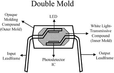 然后,組合好的引線框使用白色光傳導化合物進行澆鑄,構成光導裝置,把光從LED傳送到IC光電檢測器上。白色化合物還提供了高壓絕緣功能。最后,得到的組件使用不透明的化合物澆鑄,構成最終的封裝輪廓。