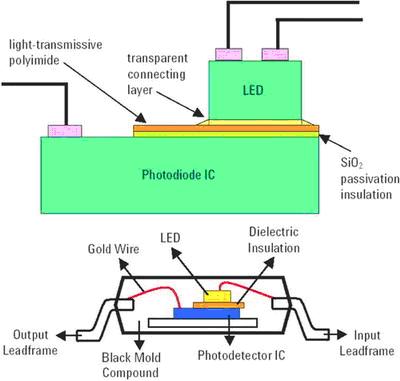 光電二極管芯片采用兩個透明的層:SiO2鈍化/絕緣和光傳導聚酰亞胺。LED使用透明的連接層穩(wěn)固地連接到光電二極管上。IC使用銀環(huán)氧樹脂,通過模具連接到引線框上。介電材料使用光傳導環(huán)氧樹脂連接到IC上。LED模具使用光傳導環(huán)氧樹脂連接到介電材料上。最后,組件使用焊接線和澆鑄。它使用標準模具連接工藝,完成所有放置,封裝在單次不透明澆鑄化合物中完成澆鑄。