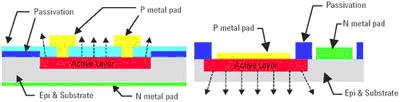 圖6傳統(tǒng)吸收基底正面發(fā)光LED與透明基底背面發(fā)光LED的橫截面