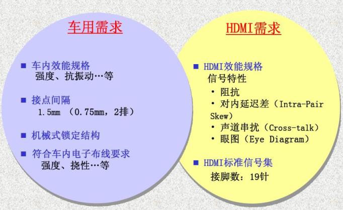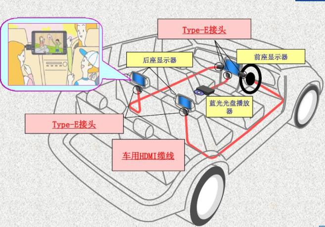 車(chē)用視頻系統(tǒng)越來(lái)越受歡迎,因此汽車(chē)生產(chǎn)商希望在他們的汽車(chē)?yán)锛蒆DMI連接功能。HDMI1.4規(guī)格為回應(yīng)汽車(chē)生產(chǎn)商的需求,提出了功能強(qiáng)大的新型車(chē)用連接系統(tǒng),可在車(chē)內(nèi)座椅后方或駕駛面板上的顯示設(shè)備上提供真高清視頻,并同時(shí)符合汽車(chē)道路駕駛中較為嚴(yán)苛的性能要求。