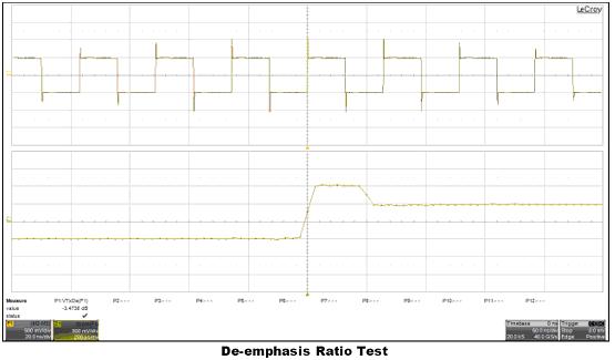 為了把5Gbps速率的數(shù)據(jù)傳送較遠的距離,USB3.0的發(fā)送端使用了去加重技術,這項測試可以測量DUT的去加重程度是否滿足規(guī)范要求(要求在-3dB到-4dB之間)。測試時DUT發(fā)送出CP7碼流,CP7碼型由50-250個連續(xù)的1和50-250個連續(xù)的0重復交替組成,而且是添加了去加重的信號波形。圖3為某USB3.0芯片的去加重測量結(jié)果,該芯片采用了-3.47dB的去加重。