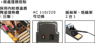 采用精密CPU數(shù)位控溫電路, 和日本進口陶瓷發(fā)熱體, 精準控制溫度200~480ºC, 整體防靜電結構, 輸入電壓AC 110V/220V可切換, 配合安全回路保護, 流線可堆疊外型, 開關前置、斜面無視角差, 適合各種環(huán)境使用焊臺、烙鐵架分離設計, 并具有錫絲架功能、使用便利.