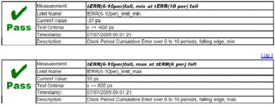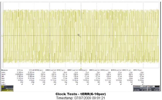 JEDEC標(biāo)準(zhǔn)要求測(cè)量n分別為2、3、4、5、6-10、11-15時(shí)tERR(n per)的最大及最小值。對(duì)于這樣的要求,如果要用手工測(cè)量將是非常耗時(shí)且低效率的。力科QPHY-DDR2軟件包的時(shí)鐘測(cè)量部分支持上述所有參數(shù)的自動(dòng)測(cè)量,僅需使用一根差分探頭將時(shí)鐘信號(hào)接入示波器即可完成所有的測(cè)量工作,測(cè)量后的所有參數(shù)結(jié)果及對(duì)應(yīng)波形將列在自動(dòng)生成的測(cè)試報(bào)告中并與JEDEC標(biāo)準(zhǔn)中門(mén)限值進(jìn)行比較。如下圖為使用QPHY-DDR2測(cè)量tERR(6-10 per)時(shí)的部分結(jié)果與對(duì)應(yīng)波形。