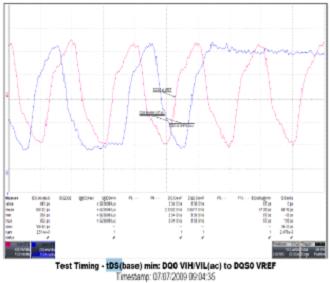 DDR2電氣性能測(cè)試部分主要測(cè)量各信號(hào)的直/交流邏輯高/低電平、信號(hào)過(guò)沖/下沖幅度及范圍、差分信號(hào)DQS及Clock輸入電壓及交叉點(diǎn)電壓、DQ及DQS輸出信號(hào)上升/下降沿斜率(SoutR、SoutF)最大/最小值、DQ,DQS及Clock輸入信號(hào)上升/下降沿斜率(SlewR、SlewF)最小值等等。