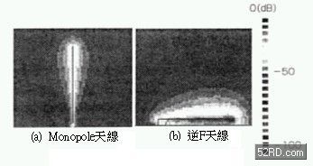 由上式可知如果縮任意小天線大小的話,Pr會比Pd小導(dǎo)致放射效率大幅降低,這種現(xiàn)象尤其是天線附近的電磁界更加明顯。圖2是提供相同電力給兩種天線時,天線附近的實際電界分布狀態(tài),圖中的單極(Monopole)天線高度為λ/4(此處λ表示天線頻率的對應(yīng)波長)屬于中等大小天線,此時單極天線最大強度大約是-20dB。