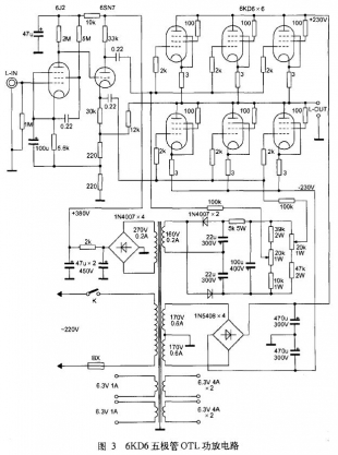 對于普通功率電子管改成三極管接法的OTL功放來說,并不是所有功率管均能采用,必須選用屏極電壓范圍較大的束射四極管或五極功率電子管,如6KD6、6L6、6P3P、6146等。同時,功放級還必須采用多只功率管并聯(lián)的方式,在8Ω低阻抗負載時,每聲道采用6只功率管并聯(lián)才能符合低阻抗負載的要求,并且輸出功率僅為30W左右。