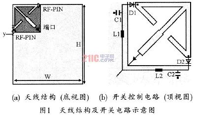 天線可以與手持設(shè)備電路板集成在一起,安裝在電路板的左上角,其結(jié)構(gòu)和RF-PIN開關(guān)控制電路示意圖如圖1所示。