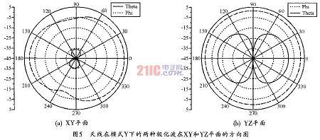 從圖3可以看出,射頻電流主要集中在天線水平方向的微帶線上(這印證了前面的分析)。但同時(shí),在中間部分的微帶以及天線其他部分也存在射頻電流,因此,天線仍會(huì)輻射部分垂直極化波。圖4所示為天線的兩種極化波在XY及YZ平面的方向圖。