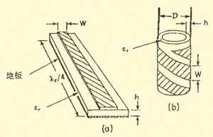 把一體化電視機視為一種計算機以后,只要把全方位螺旋微帶貼片天線直接插入數(shù)字電視機就能收看電視節(jié)目,在移動中接收數(shù)字電視,因為信號隨地理位置而變化,信道特性作動態(tài)變化,這就要求天線對不同信道的動態(tài)特性變化的穩(wěn)定可靠性做出實時反映,在移動中天線需在全方位范圍內(nèi)保持一定的帶寬和增益。為此我們設(shè)計出一種全方位圓柱體螺旋微帶貼片天線,它把1/4波長的微帶諧振器呈螺旋狀地繞在具有一定厚度(h)的空心圓柱體上,其微帶貼片與地板構(gòu)成同軸圓柱體,體積比較小,可以和任何載體共形(例如汽車),同時也能設(shè)計成任何規(guī)格(例如:50Ω,75Ω)的帶線與同軸聯(lián)結(jié)器聯(lián)結(jié),不需要匹配網(wǎng)絡(luò),且空芯內(nèi)部可以安裝有源電子器件。圖1就是1/4波長全方位微帶螺旋貼片天線的示意圖,(a)是1/4波長微帶諧振器,(b)是1/4波長全方位微帶螺旋貼片天線的示意圖。