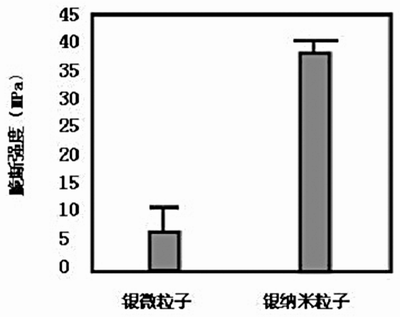 日本大阪大學(xué)應(yīng)用銅質(zhì)圓板型試驗片作銀納米粒子連接試驗,分別測出了銀微米粒子(平均粒徑為100nm)和銀納米粒子的脆斷強(qiáng)度(見圖7)。其中,該試驗是在300℃、保溫300min、加壓5Mpa的條件下進(jìn)行的。如圖7所示,納米粒子連接與微粒子連接相比,顯示出了很高的脆斷強(qiáng)度。