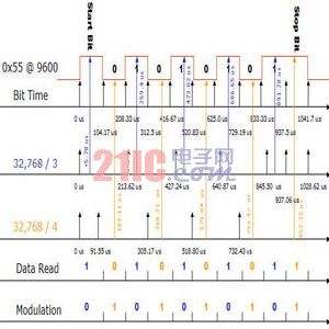 UART數(shù)據(jù)用10,922波特或8,192波特的UART接收。由于UART在傳輸中間點(diǎn)對(duì)數(shù)據(jù)進(jìn)行采樣以補(bǔ)償抖動(dòng),因此該點(diǎn)已經(jīng)被選擇為接收UART的采樣點(diǎn)。在沒有行抖動(dòng)的理想情況下,10,922波特UART對(duì)第三數(shù)據(jù)位的開始兩次讀數(shù)都會(huì)是錯(cuò)誤的而8,192波特的UART由于會(huì)完全遺漏第三位,很快就將出錯(cuò)。由于低功耗應(yīng)用的理想時(shí)鐘是低功耗實(shí)時(shí)時(shí)鐘模式,這使得在低功耗環(huán)境中處理很困難。解決這一問題的最好辦法就是將µC與調(diào)制技術(shù)結(jié)合使用,用32kHz振蕩器提供非常精確的2,400波特,并完全能支持9,600波特(參見圖3)。