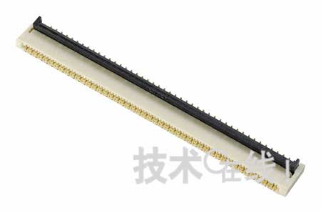 此制品以間距0.3mm、高1.1mm、進(jìn)深4.3mm(滑片鎖上時)尺寸,制成了90引腳的多極連接器。合適的FPC厚度為0.2mm。因采用上下配備接點的構(gòu)造,設(shè)計時可無需考慮插入的FPC接點方向。