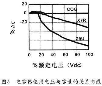 ①電容器的使用電壓對(duì)電容器的電容量有影響,穩(wěn)定性低的介質(zhì),在施加額定工作電壓后容量會(huì)大幅度下降(見圖3),以至達(dá)不到使用效果,這一點(diǎn)在選擇電容器時(shí)必須給以充分注意(不能一味追求大容量和小體積,必須在容量和使用電壓上留有充分余地)。