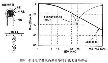 我們平常使用的陶瓷圓片電容器作為旁路電容,可以將高頻干擾短路到地,達(dá)到抗干擾的目的。但是電容器的引線電感及電容內(nèi)部的剩余電感卻限制了它的高頻特性發(fā)揮。圖6是普通電容器做高頻旁路時(shí)的引線電感影響例。