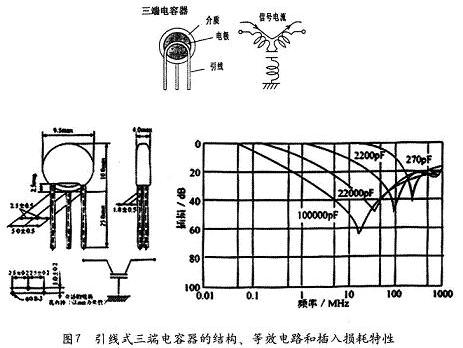 由于普通的兩端電容有引線電感,所以總的剩余電感較大,自諧振點(diǎn)也比較低。為了改進(jìn)普通引線式電容器的自諧振、且自諧振頻率偏低的問(wèn)題,村田制作所曾發(fā)展了一種引線式三端電容器,見圖7。與兩端電容相比,這個(gè)電容的上引線化成了兩根(所以三端電容有三根引線)。三端電容器的這兩根上引線化成了信號(hào)傳輸線的一部分,于是引線電感與電容器變成了一個(gè)“LC”濾波器。正是三端電容器巧妙地利用了引線電感,使得三端電容器對(duì)干擾的抑制作用更好。三端電容器也有自諧振問(wèn)題,為了最大限度地限制這個(gè)問(wèn)題,使用時(shí)三端電容器接地的這根引腳的長(zhǎng)度應(yīng)該受到限制。