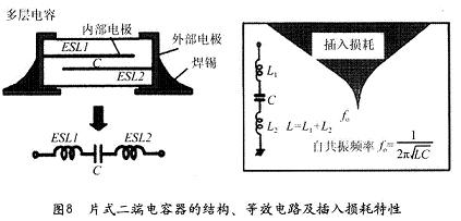 應(yīng)該說(shuō)片式二端電容器的出現(xiàn)對(duì)于改進(jìn)普通引線式電容器的自諧振問(wèn)題是很有好處的,因?yàn)槠蕉穗娙萜鞯囊€長(zhǎng)度得到了最大限度縮減。但由于電容器內(nèi)部的構(gòu)造,并不能夠消除內(nèi)部電極的殘留電感,這樣當(dāng)頻率達(dá)到使電容器的容抗XC同殘留電感的XL的絕對(duì)值相等時(shí),二端電容依然會(huì)產(chǎn)生自諧振,參見圖8。由于自諧振頻率的存在,當(dāng)噪聲的頻帶超過(guò)自諧振頻率之后,噪聲的抑制效果會(huì)急速下降。但是與普通有引線的二端電容相比較,還是有很大改進(jìn)。
