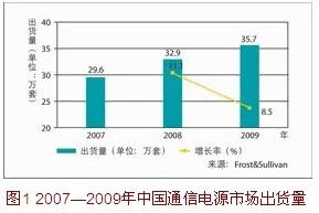 2009年被稱作中國(guó)3G的元年,3G網(wǎng)絡(luò)的建設(shè)直接帶來達(dá)上千億元規(guī)模的投資,配套設(shè)備同步增長(zhǎng),通信電源需求旺盛。2009年,中國(guó)通信電源市場(chǎng)收入達(dá)到37億元人民幣,較2008增長(zhǎng)了27.6%,通信電源出貨量達(dá)35.7萬套,較2008年增長(zhǎng)了 8.5%,如圖1所示。