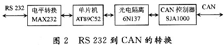 RS232串口的幀格式為:1位起始位,8位數(shù)據(jù)位,1位可編程的第9位(此位為發(fā)送和接收的地址/數(shù)據(jù)位),1位停止位。而CAN的數(shù)據(jù)幀格式為:幀信息+ID+數(shù)據(jù)(可分為標(biāo)準(zhǔn)幀和擴(kuò)展幀兩種格式)。因此,設(shè)計(jì)時(shí)就需要有一個(gè)微控制器來實(shí)現(xiàn)電平和幀格式等的轉(zhuǎn)換,其轉(zhuǎn)換方式如圖2所示。