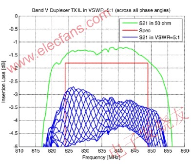 圖3:當(dāng)手機(jī)的窄帶雙工或接收濾波器沒(méi)有端接到其特征阻抗時(shí),在通帶中也會(huì)出現(xiàn)紋波。本例中,VSWR為5:1的阻抗失配使插入損耗大幅度增加。