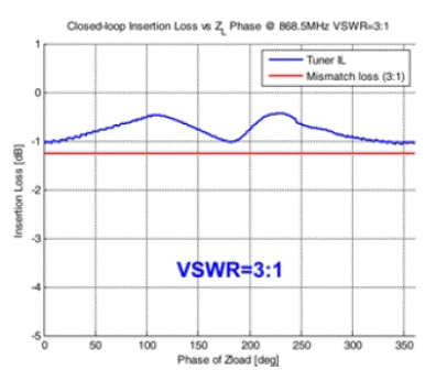 圖4:對(duì)自適應(yīng)閉環(huán)系統(tǒng)的仿真顯示,與未使用天線調(diào)諧器的系統(tǒng)(紅線)相比,加入天線調(diào)諧器(藍(lán)線)可降低插入損耗。