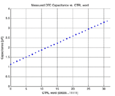 圖6:實(shí)測(cè)結(jié)果表明,5位DuNEDTC器件具有良好的線性調(diào)諧特性,電容范圍為1.15到3.4pF(調(diào)諧比為3:1)。
