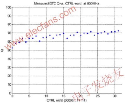圖7:DuNEDTC器件的品質(zhì)因數(shù)實(shí)測(cè)結(jié)果,在900MHz時(shí)其Q值為60-70。