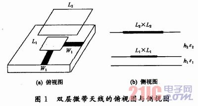 [page]1.3雙層微帶天線的尺寸參數(shù)本文采用的基板是TACNIC公司的介質(zhì)基板,ε1=2.65,h=O.5mm。其中,上貼片L2=95mm,下貼片L1=70mm;底層介質(zhì)基板的厚度為h1=1mm,中間空氣層的厚度為h2=13mm,介電常數(shù)為ε2=1.0(也可以采用介電常數(shù)接近于1的泡沫材料代替空氣層,本文選擇用空氣層來達到降低有效介電常數(shù)的目的)。
