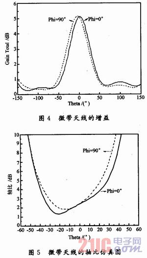 由圖4可以看到,雙層微帶天線的增益達到了5.2dB,較之傳統(tǒng)的微帶天線增益有少許增加,由此可見,雙貼片的微帶天線在提高增益方面也有一定的貢獻。若要大幅度提高微帶天線的增益,則可以在頂層貼片上再覆蓋一層εr>>1的介質(zhì)基板即可。從圖5中可以看出,微帶天線的部分軸比小于3dB,從而實現(xiàn)了天線的圓極化,但是微帶天線的最大輻射方向偏離軸向,天線的軸向比變差。該微帶天線基本可以滿足圓極化的要求。