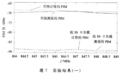 在800 MHz頻段內(nèi),測量的接50 Ω負(fù)載的PIM值的范圍是-69.3~-70.5 dBm,差值為1.2 dB,計(jì)算的接50 Ω負(fù)載的PIM值的范圍是-68.8~-69.5 dBm,差值為0.7 dB,可以得出計(jì)算和測量的值相差很小。測量的開路狀態(tài)的PIM值的范圍是-88.4~-89.2 dBm,差值為O.8 dB計(jì)算的開路狀態(tài)的PIM值的范圍是-88.1~-89.1 dBm,差值為1 dB。接負(fù)載和開路,兩者PIM大約差19 dB。