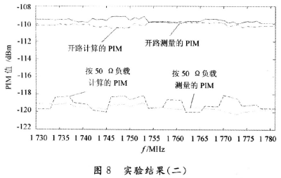 在l 800 MHz頻段內(nèi),測量的接50 Ω負(fù)載的PIM值的范圍是-119.1~-120.0 dBm,差值為O.9 dB。計(jì)算的接50 Ω負(fù)載的PIM值的范圍是-118.1~-120.0 dBm,差值為1.9 dB可以得出計(jì)算和測量的值相差很小。