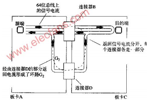 一個(gè)64位總線從板卡A經(jīng)過連接器B連到母板卡上,母板卡可能是一個(gè)主CPU卡或是一個(gè)通往其他子卡的無源通道。64條信號(hào)線的返回電流從母板卡C流回板卡A,其中的絕大部分通過了連接器B的接地腳。